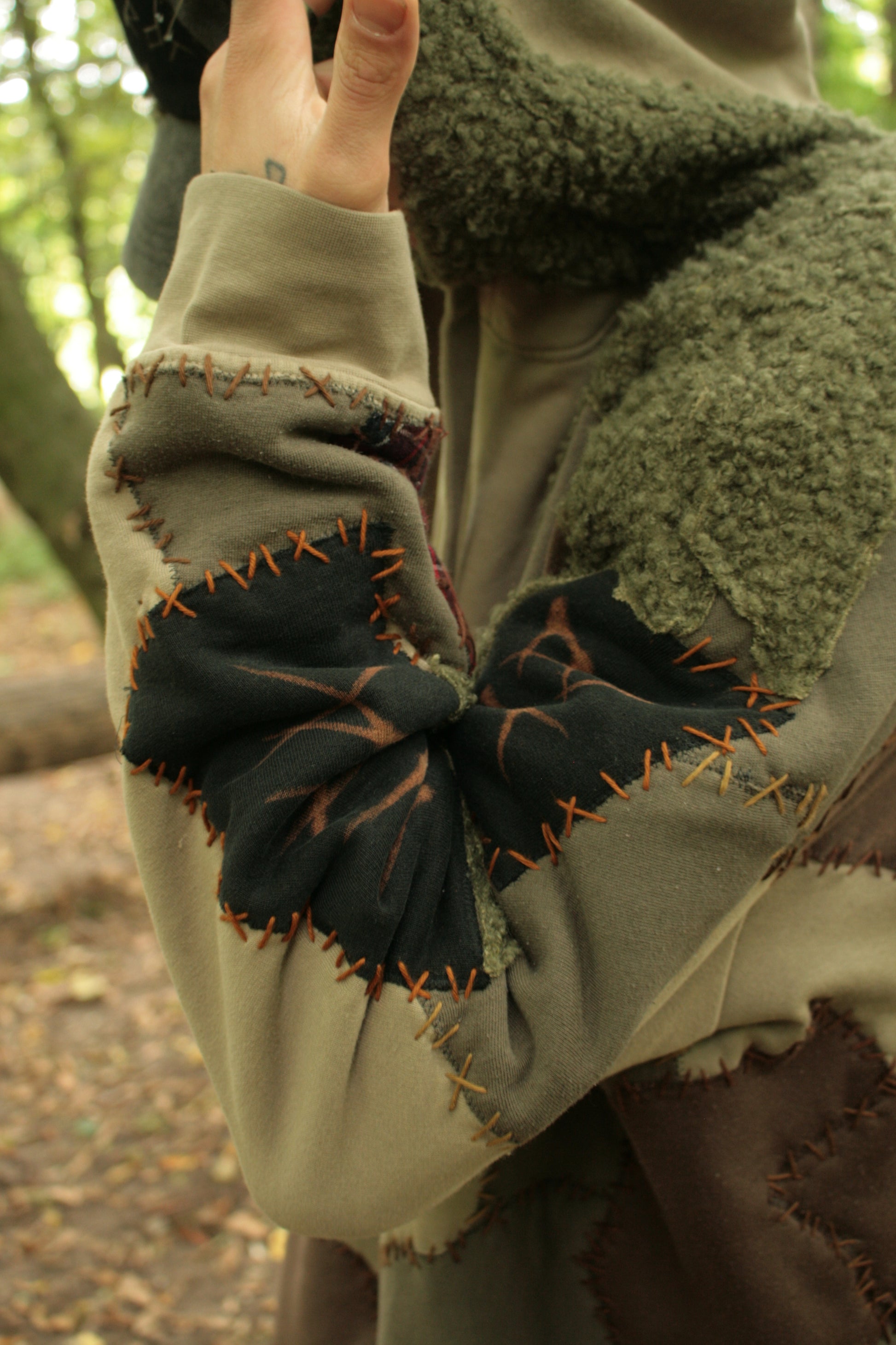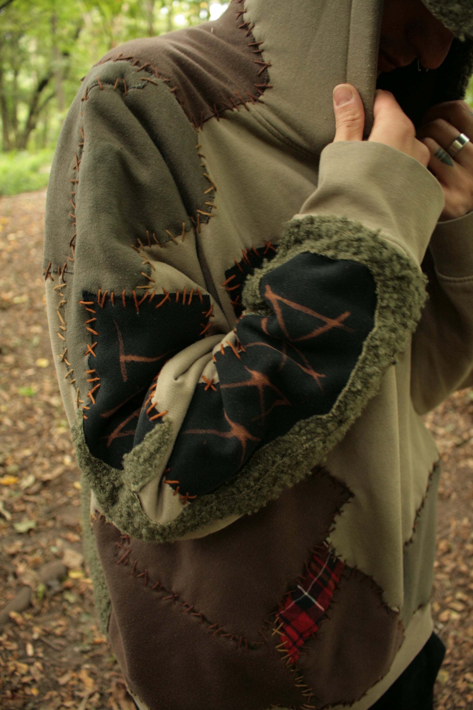 Patchwork hoodie with moss optics and "Laputa- castle in the sky" back patch